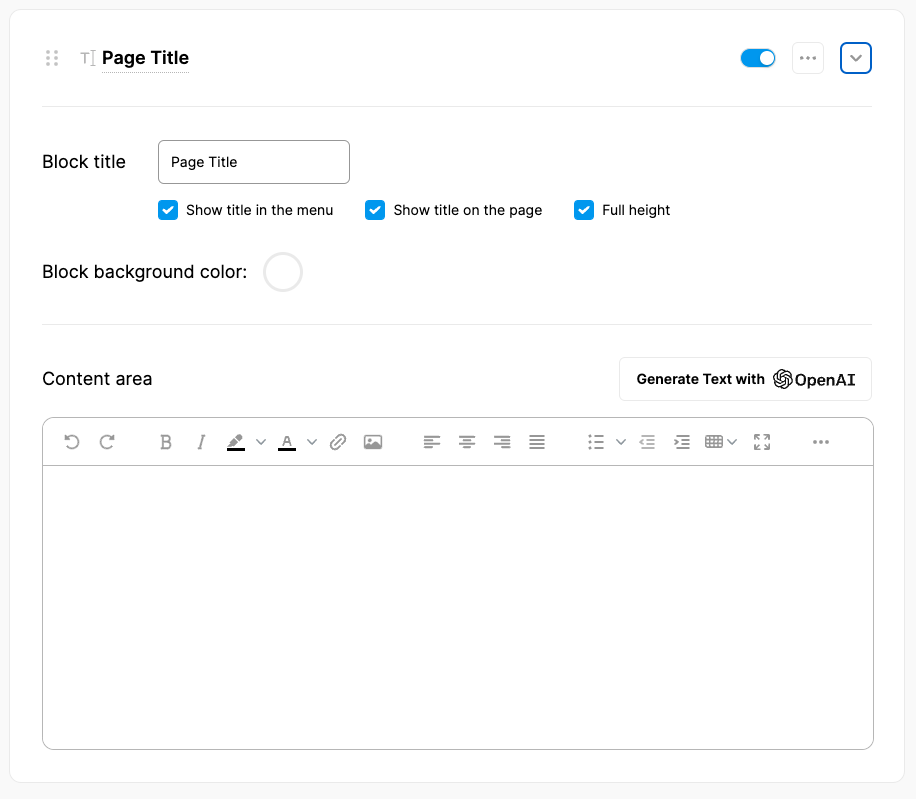 - Page Title: Customize the title of the free block to your preference. The title you enter can be displayed as a menu item in the header or used as the title for the free block within the content area