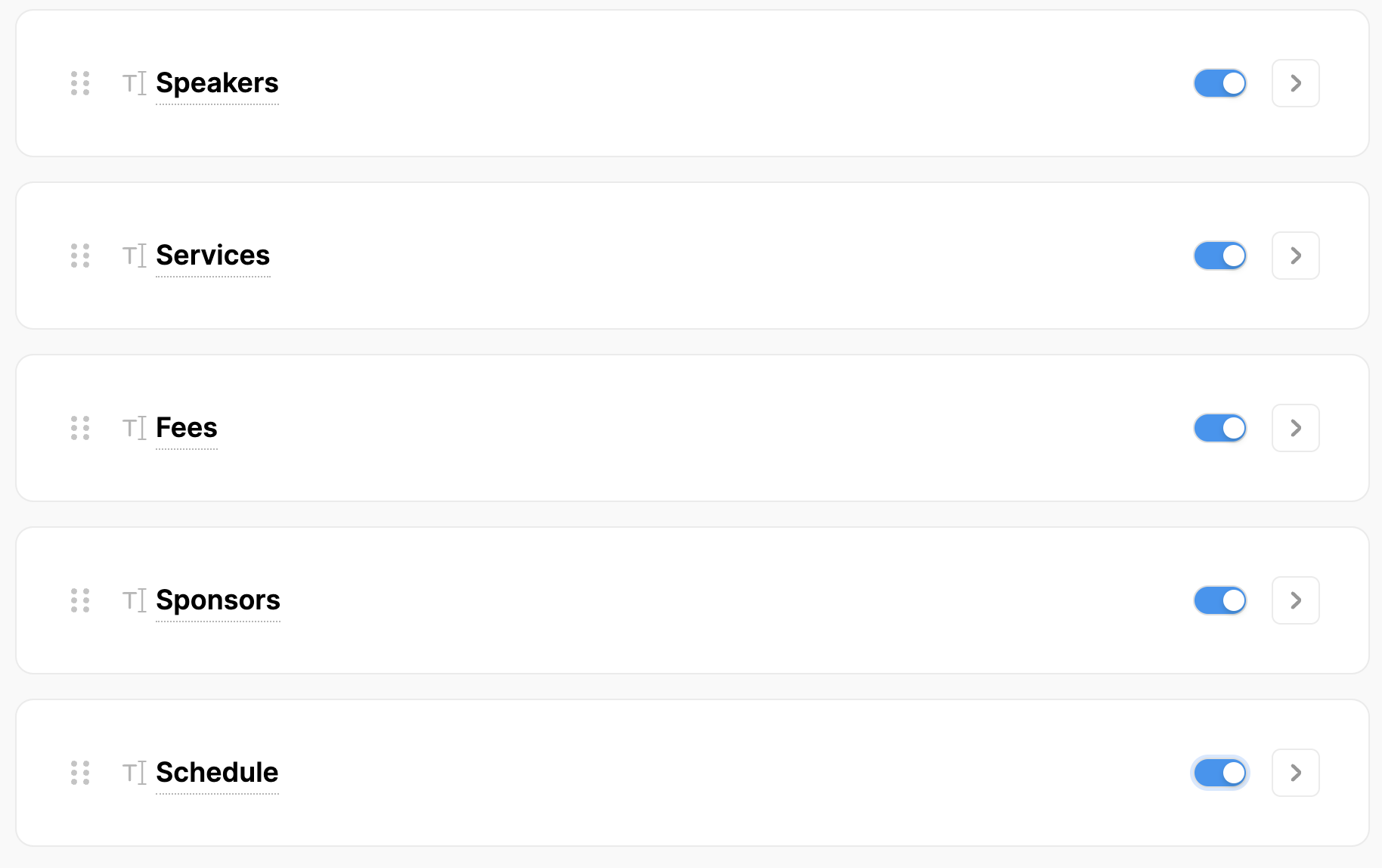 You have the option to add two types of content blocks to your web page: ‘Free Blocks’ and ‘System-Generated Blocks’. Free Blocks allow you to add custom content to your event web page, while System-Generated Blocks are automatically generated using the information you provided during setup. You can easily toggle the visibility of both types of blocks to hide or display them, and you can also rearrange their display order by dragging them up or down on the settings page.
