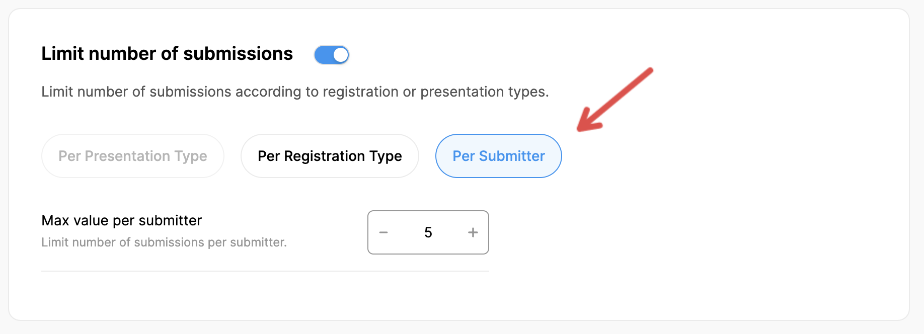 Per Submitter: If you set up only Abstract Submission Form you can limit submission according to the submitter. Once the submission limit is set submitters will not be able to submit more abstracts than the limit you have defined. This helps you control the number of submissions and manage the abstract submission process according to your requirements.